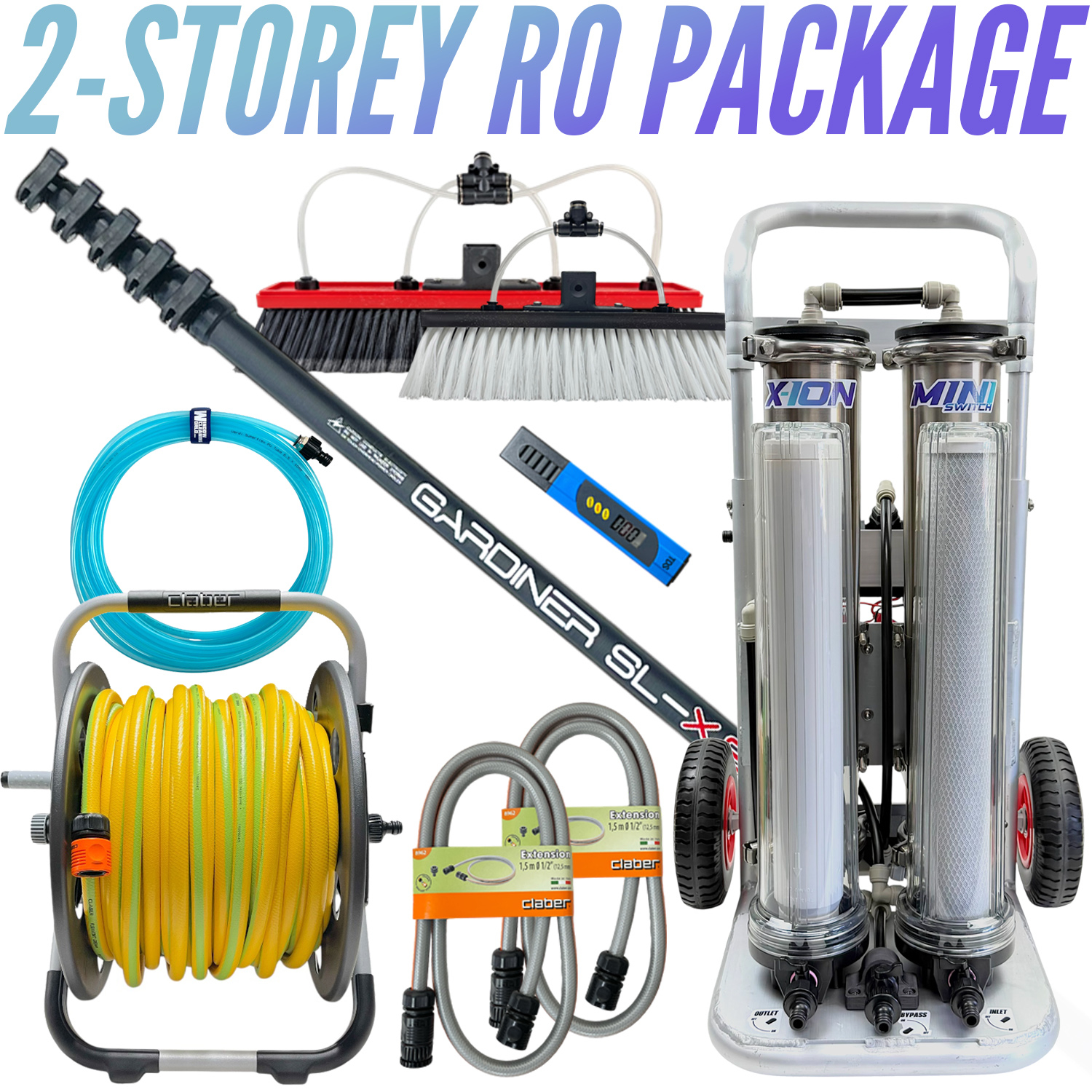 The X-ION Mini Switch Reverse Osmosis System is highly effective at filtering hard water, delivering pure water for streak-free results. This package includes everything you need to get started with water-fed window cleaning — the right way.