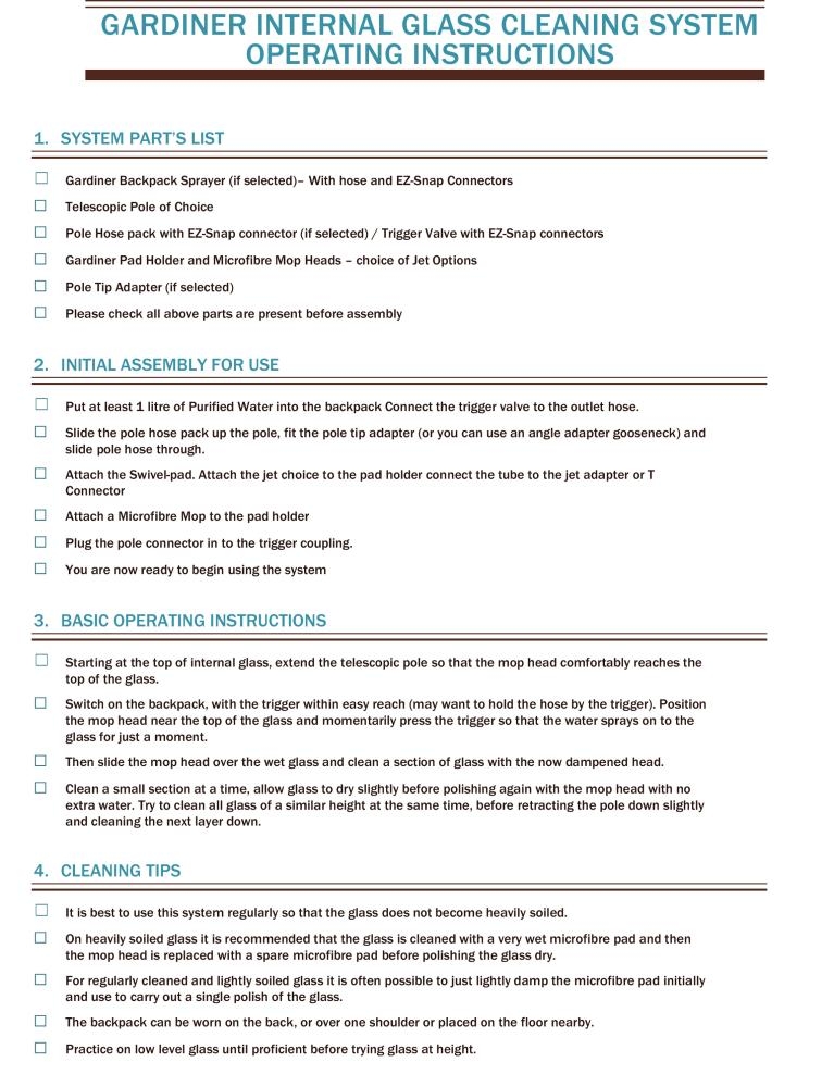 Note: This system is designed to lightly mist the glass before polishing it with the microfibre pads — it’s not intended for continuous water flow like outdoor water-fed systems - Please read the User Guide for proper use of this equipment.